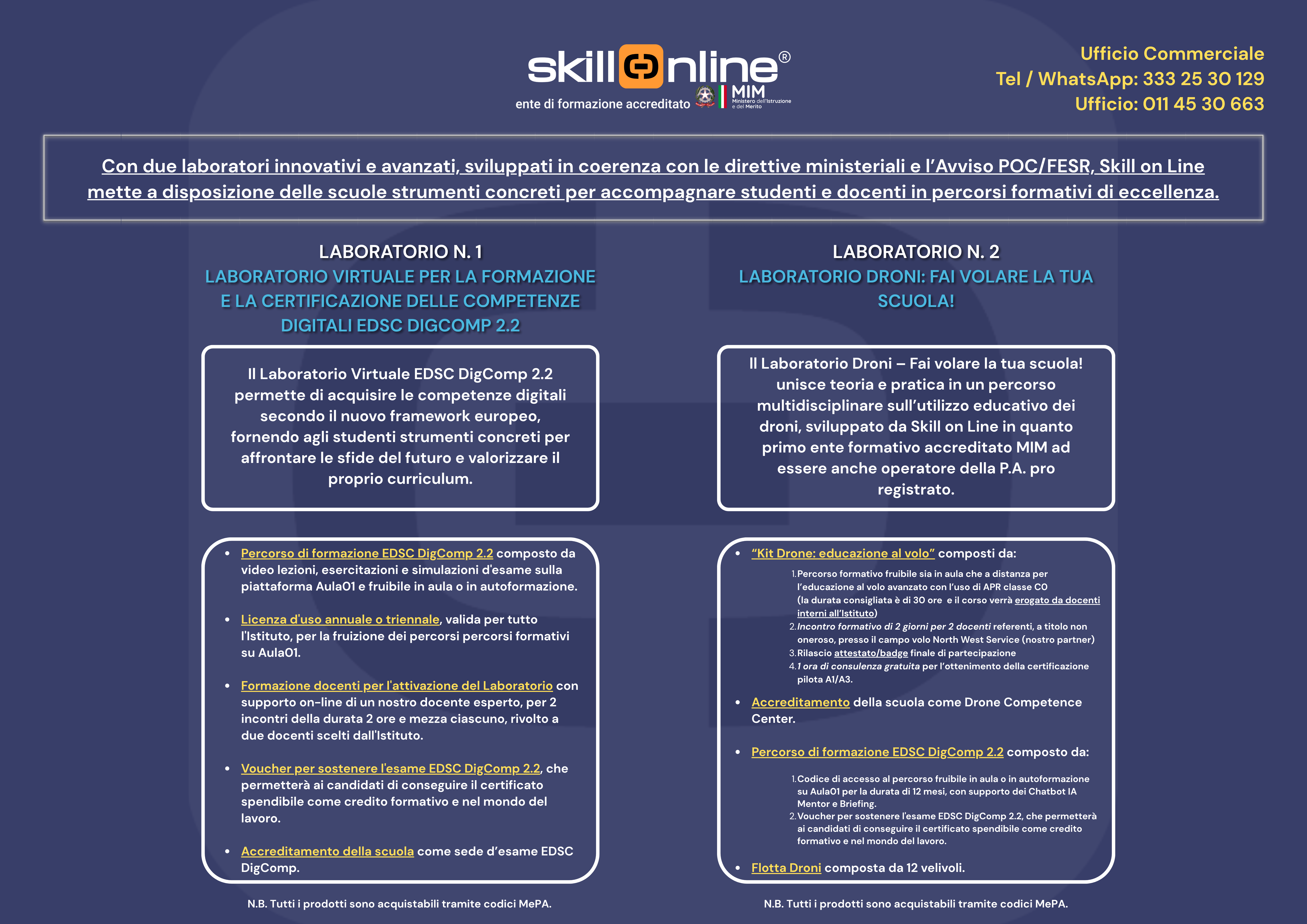 ll Laboratorio Droni: Fai volare la tua scuola! unisce teoria e pratica in un percorso multidisciplinare sull’utilizzo educativo dei droni, sviluppato da Skill on Line in quanto primo ente formativo accreditato MIM ad essere anche operatore della P.A. pro registrato.